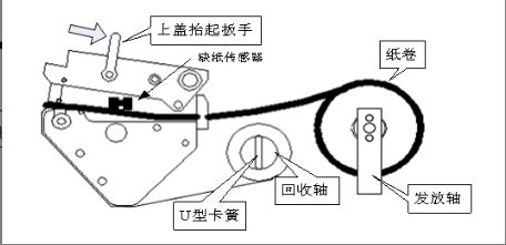 2. 抬起打印头,将纸装入打印头正下方,且标签纸位于缺纸传感器下面;