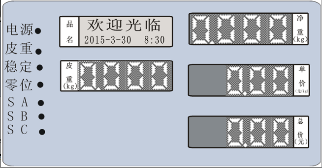 显示:双面红光LED&LCD显示,皮重窗4位、净重窗5位、单价窗5位、总价窗7位,LCD可显示汉子、英文、字符等。