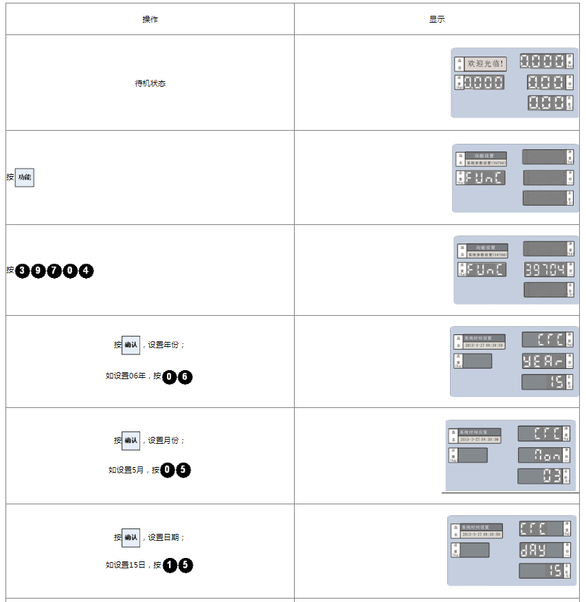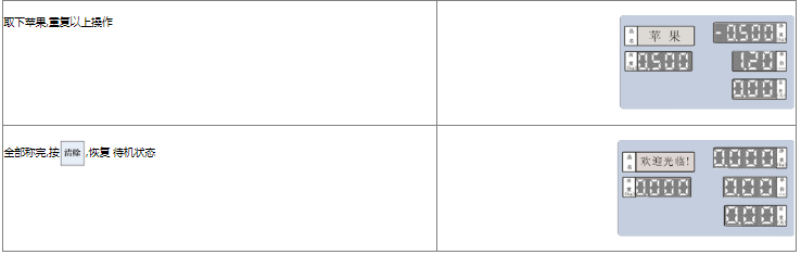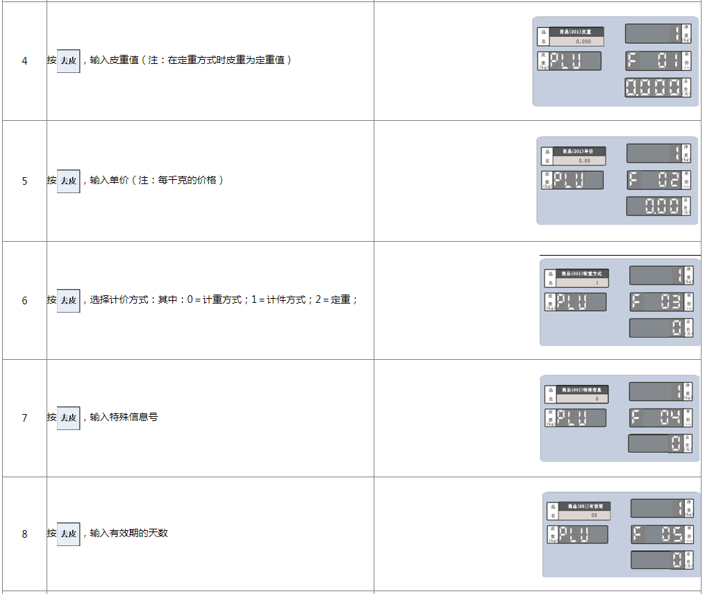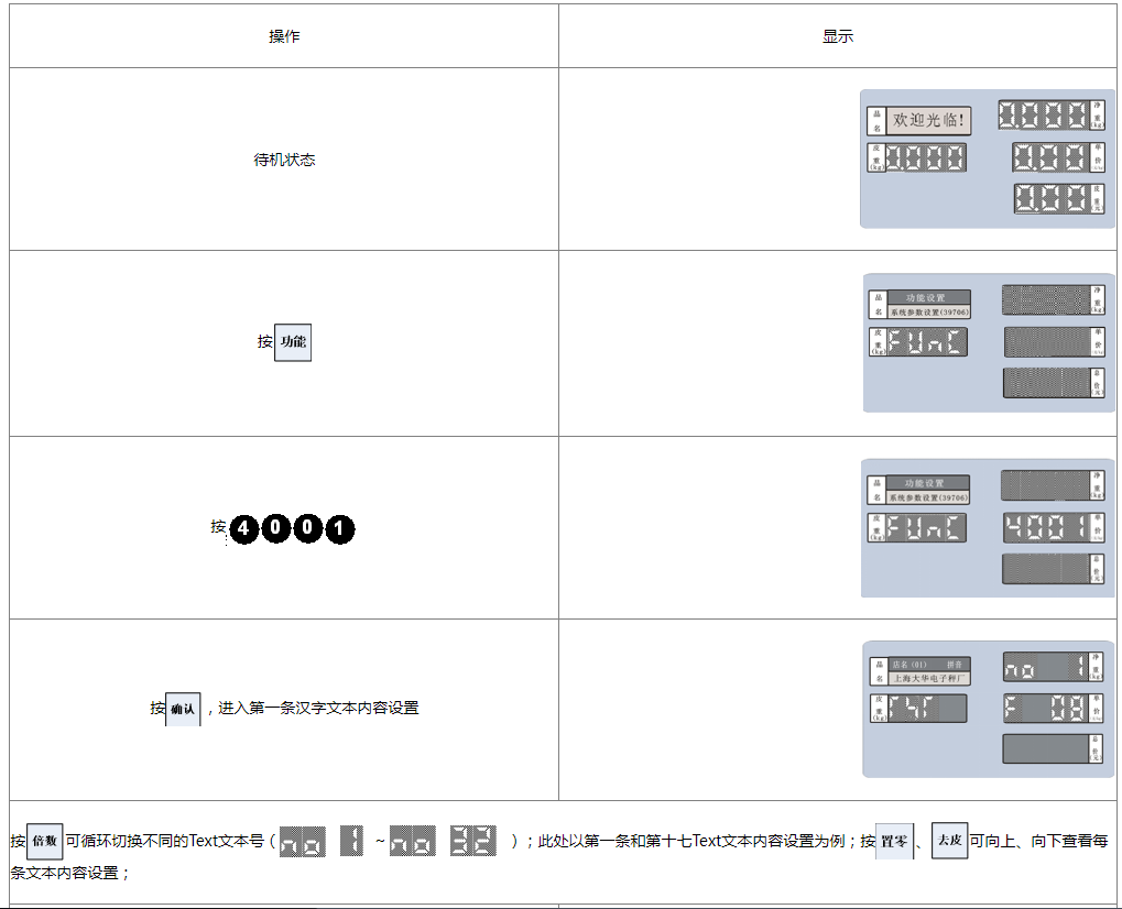 阅读本手册时,操作见表格最左列,表格其余列为实施最左列操作后条码打印计价秤各个窗口的显示内容;