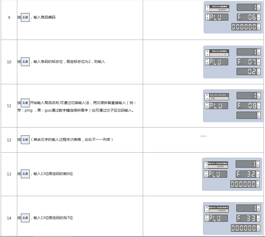 本秤可存储9999条PLU信息,编辑PLU信息的方式为: